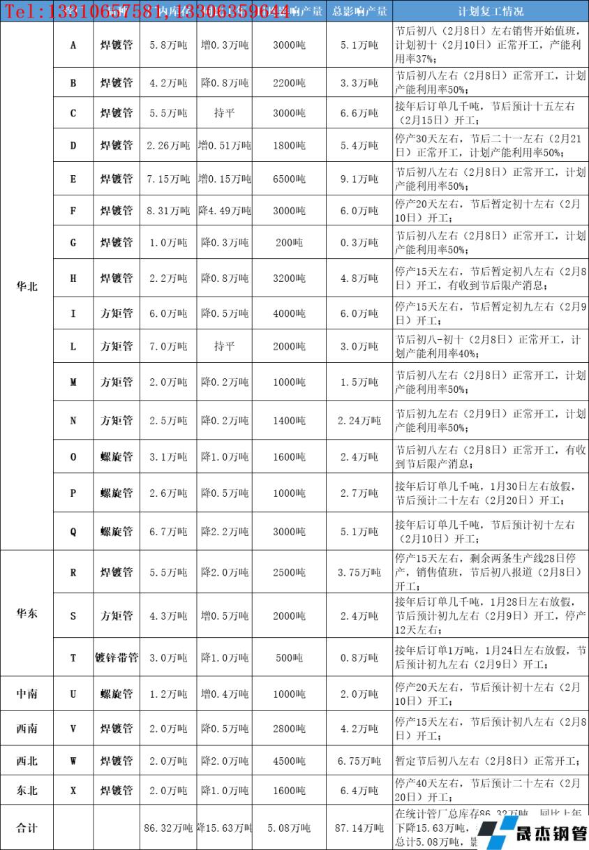 【停產】在統計焊接厚壁無縫鋼管管廠集中停產時間在臘月二十三(1月25日)至正月初八(2月8日)左右,平均停產時間17天,較去年縮短5天;最新統計管廠產能利用率40%左右,較去年春節前最后一次統計數據增長6.86個百分點;春節期間影響總產量87.14萬噸,較去年減少21.17萬噸,下降19.55%。