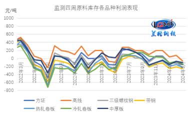 以四周原料庫存測算各品種的毛利表現來看,隨著各品種的成本下降,市場價格大幅下移,3月份四周庫存原料測算品種毛利中,各品種毛利均有所轉差;研究中心監測數據顯示,監測的七大品種月均虧損幅度擴大35-147元/噸。