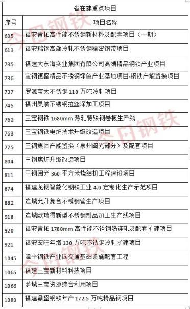 2022年2月25日,福建省發(fā)布《2022年重點(diǎn)項(xiàng)目名單》,其中共涉及三鋼、寶鋼、三寶鋼鐵、福建龍鋼、鼎盛鋼鐵等多個(gè)鋼企的二十個(gè)鋼鐵項(xiàng)目!在這20個(gè)項(xiàng)目中,僅不銹鋼項(xiàng)目就有9個(gè),其中包括寶鋼德盛、福安青拓、寶太不銹鋼等龍頭企業(yè)提高產(chǎn)能規(guī)模、補(bǔ)齊鏈條短板的多個(gè)項(xiàng)目,而這也彰顯了福建以龍頭企業(yè)為主導(dǎo),以協(xié)作配套項(xiàng)目為依托,推動產(chǎn)業(yè)跨區(qū)轉(zhuǎn)移集聚和上下游聯(lián)動,打造千億不銹鋼產(chǎn)業(yè)集群的重要規(guī)劃。
