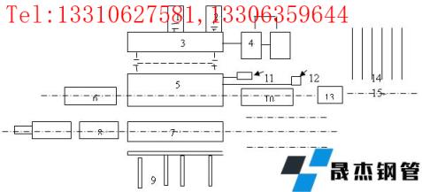 12 冷床:步進(jìn)梁式,由動梁和靜梁組成。動梁由提升電機(jī)和平移電機(jī)驅(qū)動,這種冷床的特點:(1)冷卻均勻,(2)厚壁鋼管表面損傷少,(3)具有矯直功能
