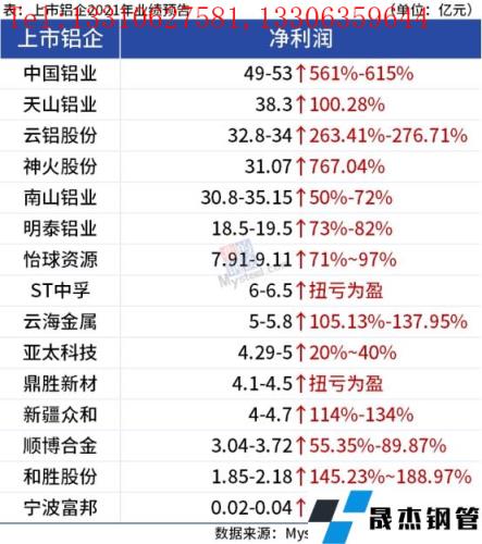 免責聲明:本網(wǎng)站(山東聊城晟杰無縫鋼管廠www.cuirutang.cn)刊載的“15家上市鋁企2021年業(yè)績飄紅,神火股份大增超7倍”等均源于網(wǎng)絡(luò),版權(quán)歸原作者所有,且僅代表原作者觀點,本文所載信息僅供參考。轉(zhuǎn)載僅為學(xué)習與交流之目的,如無意中侵犯您的合法權(quán)益,請及時聯(lián)系刪除。本網(wǎng)站刊登此篇文章并不意味著本站贊同其觀點或證實其內(nèi)容的真實性,我們不對其科學(xué)性、嚴肅性等作任何形式的保證。如果侵犯了您的版權(quán),請盡快聯(lián)系我們予以撤銷,謝謝合作!
