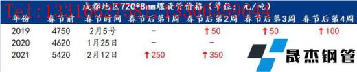 小編匯總近3年春節后四周螺旋管品種主流城市價格變化情況,2019、2021年主流城市螺旋管價格在節后以上漲為主。2020年受公共衛生事件影響,復工延期,需求出現滯后現象,部分城市在春節后價格出現下跌。