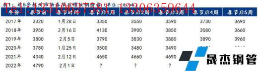 免責聲明:本網站(山東聊城晟杰無縫鋼管廠www.cuirutang.cn)刊載的“近5年春節前后杭州市場價格和庫存走勢”等均源于網絡,版權歸原作者所有,且僅代表原作者觀點,本文所載信息僅供參考。轉載僅為學習與交流之目的,如無意中侵犯您的合法權益,請及時聯系刪除。本網站刊登此篇文章并不意味著本站贊同其觀點或證實其內容的真實性,我們不對其科學性、嚴肅性等作任何形式的保證。如果侵犯了您的版權,請盡快聯系我們予以撤銷,謝謝合作!