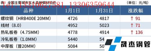 1月國內(nèi)厚壁無縫鋼管市場整體呈現(xiàn)了震蕩偏強走勢,而板材價格分化明顯,螺紋鋼修復(fù)性反彈近百元,熱軋板卷上漲了136元,但中厚板表現(xiàn)趨弱。原料方面價格漲幅強于預(yù)期,1月在無縫厚壁鋼管廠家復(fù)產(chǎn)和節(jié)前補庫需求支撐下,鐵礦石價格持續(xù)上漲,62%澳洲粉礦港口現(xiàn)貨價格指數(shù)960.0元/濕噸,環(huán)比月初上漲158.0元/濕噸,漲幅19.7%。整體來看,宏觀消息面利好,厚壁無縫鋼管供應(yīng)快速下滑,導(dǎo)致庫存累積幅度不及預(yù)期,而需求結(jié)束較晚,使得鋼價走強。
