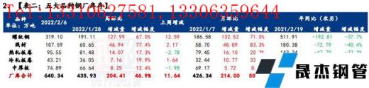 節(jié)后第一周五大品種庫(kù)存累增幅度如期加速,從日均增庫(kù)方面來說,建材和板材總庫(kù)存2022年春節(jié)期間分別日均增加41.49萬噸/天和6.27萬噸/天,同比去年分別下降19%和45%;五大品種無縫厚壁鋼管廠家?guī)齑婧蜕鐣?huì)庫(kù)存2022年春節(jié)期間分別日均增加18.58萬噸/天和27.32萬噸/天,同比去年分別下降28%和26%。由此可見,今年庫(kù)存累庫(kù)幅度和速度依然預(yù)期內(nèi)低于去年同期水平。從后期庫(kù)存增幅預(yù)期來看,除2020年疫情影響累庫(kù)天數(shù)41天之外,2018年、2019年、2021年春節(jié)后累庫(kù)天數(shù)均在20天至21天,預(yù)計(jì)今年累庫(kù)天數(shù)將與此保持相對(duì)一致,累庫(kù)天數(shù)或受雨雪天氣影響略有延長(zhǎng),達(dá)到21至23天左右,峰值或在3月第二周期間出現(xiàn)。