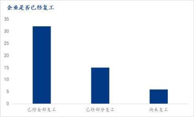 2、截止調研日,已經有超過88.68%的企業完全復工或部分復工,未復工的企業也將在未來1-2周之內復工;復工企業當中基本都已正常生產,只有5.7%企業延遲1-2周恢復到正常生產狀態;