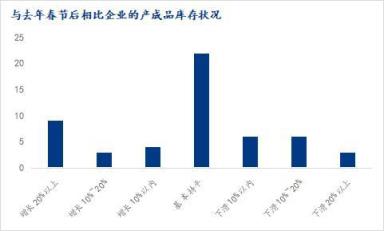 調研樣本企業中,相比去年春節后產成品庫存方面,增長20%以上的企業占比16.98%,增長10%-20%的企業占比5.66%,增長10%以內的占比為7.55%;與去年持平的企業占比41.5%;下滑10%以內的企業占比11.32%,下滑10%-20%的企業占比11.32%,下滑20%以上的企業占比5.66%。