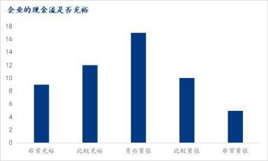 調研樣本企業中,現金流非常充裕(維持半年以上)的企業占比為16.98%,現金流比較充裕(維持3-6個月)的企業占比有22.64%,現金流有些緊張(維持1-3個月)的企業占比有32.08%,現金流比較緊張(維持1個月)的企業占比有18.87%,現金非常緊張(基本沒有現金流)的企業占比為9.43%。