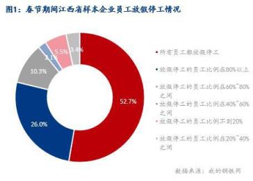 據調研,春節期間江西省樣本企業所有員工都放假停工的企業占調研樣本比例為52.7%,放假停工的員工比例不到20%的企業僅占比5.5%;放假停工的員工比例在60%以上的企業樣本占比達到89%。