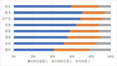 從未復(fù)工的企業(yè)調(diào)研情況來看,截至2月11日,計(jì)劃在2月7日-13日(節(jié)后第一周)復(fù)工的企業(yè)占比11.5%,計(jì)劃在2月14日-29日(節(jié)后第二周)復(fù)工的企業(yè)占比17.6%。預(yù)計(jì)節(jié)后兩周內(nèi),超九成企業(yè)都將完成復(fù)工,鋼鐵、能化、農(nóng)產(chǎn)品行業(yè)企業(yè)復(fù)工率預(yù)計(jì)達(dá)到93%以上。