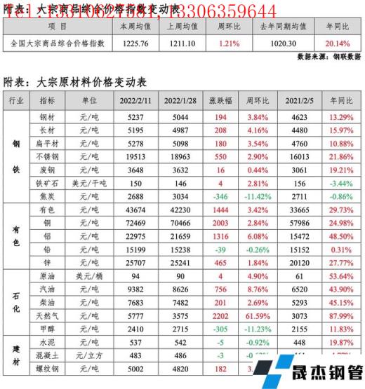 免責聲明:本網站(山東聊城晟杰無縫鋼管廠www.cuirutang.cn)刊載的“MRI:大宗原材料價格周報(2月7日-2月11日)”等均源于網絡,版權歸原作者所有,且僅代表原作者觀點,本文所載信息僅供參考。轉載僅為學習與交流之目的,如無意中侵犯您的合法權益,請及時聯系刪除。本網站刊登此篇文章并不意味著本站贊同其觀點或證實其內容的真實性,我們不對其科學性、嚴肅性等作任何形式的保證。如果侵犯了您的版權,請盡快聯系我們予以撤銷,謝謝合作!