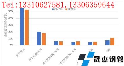 從不同行業的停工比例來看,鋼鐵、建材由于季節性生產和消費特征明顯,停工比例達到80%的企業數量明顯高于其他行業,且較去年相比,鋼鐵、建材行業停工比例達到80%及以上企業數量占比分別提高3.4和5.9個百分點。