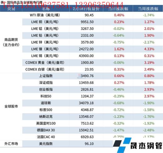 金融市場:本周主要商品期貨品種價格除原油和鎳下跌外,其余均上漲;全球股市中,中國股市上漲明顯,歐美股市基本下跌;美元指數96.1,上漲0.07%。