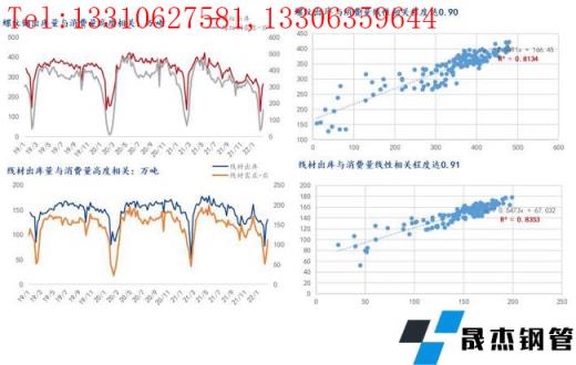 無縫厚壁鋼管廠家出庫量(周實際產量-無縫厚壁鋼管廠家庫存環比變化)與周表觀消費量(產量-總庫存環比變化;總庫存=無縫厚壁鋼管廠家庫存+社會庫存)高度相關,以主要品種建筑厚壁無縫鋼管為例,螺紋鋼和線材的無縫厚壁鋼管廠家出庫量與周表觀消費量相關系數均高達0.9。