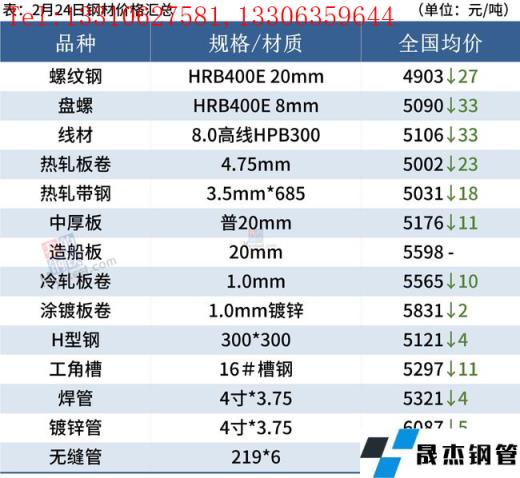 建筑厚壁無縫鋼管:2月24日,全國31個主要城市20mm三級抗震螺紋鋼均價4903元/噸,較上個交易日跌9元/噸。短期來看,一方面當前國際形勢緊張,導致市場情緒偏空;另一方面,近期鐵礦等原料價格下挫,拖累成材價格,加上近期需求恢復不及預期,短期仍然處于供需雙弱格局。因此預計25日國內建筑厚壁無縫鋼管或將維持弱勢運行。