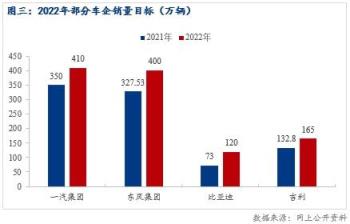 隨著2021年年底芯片緊張問題得到逐漸緩解。展望2022年汽車市場,如不再受到“缺芯”影響,汽車產(chǎn)能可以得到良好的釋放。從汽車銷售市場來看,在供給得到改善的情況下,今年的汽車銷量仍會保持較高增長,其中包含回補(bǔ)去年由于產(chǎn)量不足而導(dǎo)致的銷量缺失部分。我們在網(wǎng)上公開資料了解到,各大車企在制定今年的銷量目標(biāo)時都是保持穩(wěn)增長的態(tài)勢。在此做了簡單整理: