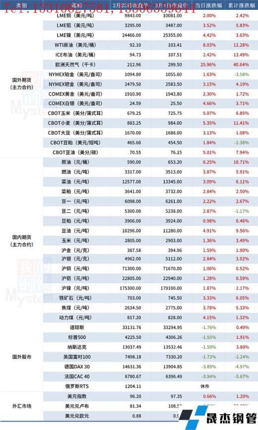免責聲明:本網站(山東聊城晟杰無縫鋼管廠www.cuirutang.cn)刊載的“受近期局勢影響大宗商品價格一覽表(3月1日)”等均源于網絡,版權歸原作者所有,且僅代表原作者觀點,本文所載信息僅供參考。轉載僅為學習與交流之目的,如無意中侵犯您的合法權益,請及時聯系刪除。本網站刊登此篇文章并不意味著本站贊同其觀點或證實其內容的真實性,我們不對其科學性、嚴肅性等作任何形式的保證。如果侵犯了您的版權,請盡快聯系我們予以撤銷,謝謝合作!