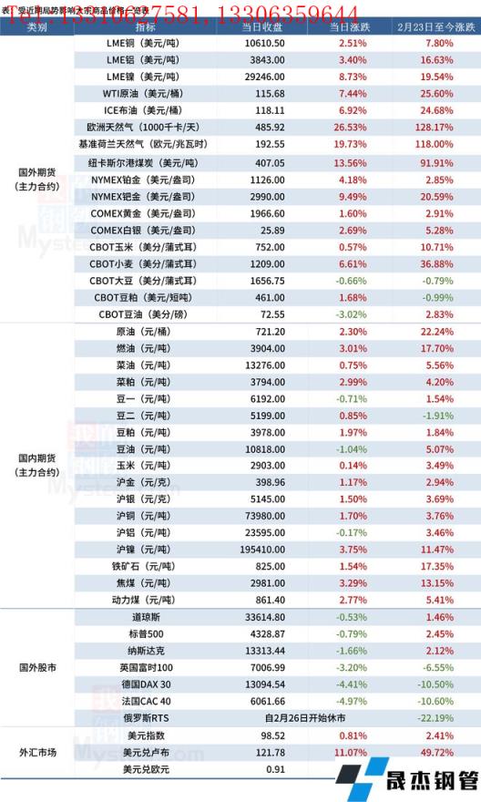 近期,受國際局勢影響,全球金融及大宗商品市場出現(xiàn)較大波動。3月4日,歐美股市經(jīng)歷“黑色星期五”,國際油價、天然氣大幅上漲,油價本周波動幅度創(chuàng)歷史新高。匯總情況如下: