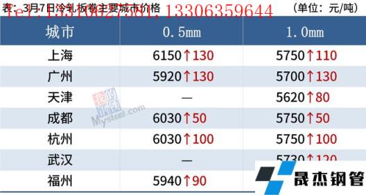 冷軋板卷:3月7日,全國(guó)24個(gè)主要城市1.0mm冷卷均價(jià)5711元/噸,較上個(gè)交易日上漲68元/噸。據(jù)局部區(qū)域貿(mào)易商反饋,今日冷軋價(jià)格漲幅明顯,市場(chǎng)交投情緒濃郁,商戶(hù)多以出貨兌現(xiàn)為主,中小貿(mào)易商逢低補(bǔ)貨,下游行業(yè)訂貨量有所增加;近日無(wú)縫厚壁鋼管廠家資源陸續(xù)倒庫(kù),庫(kù)存壓力偏大,東南地區(qū)主流市場(chǎng)庫(kù)存偏高。綜合來(lái)看,預(yù)計(jì)8日全國(guó)冷軋價(jià)格仍有小幅補(bǔ)漲空間。