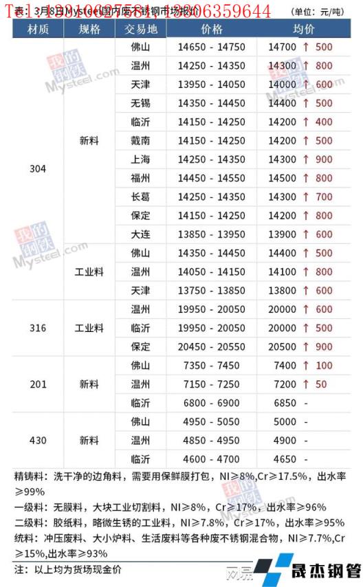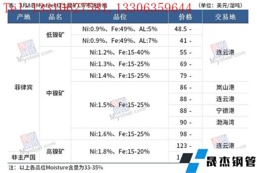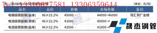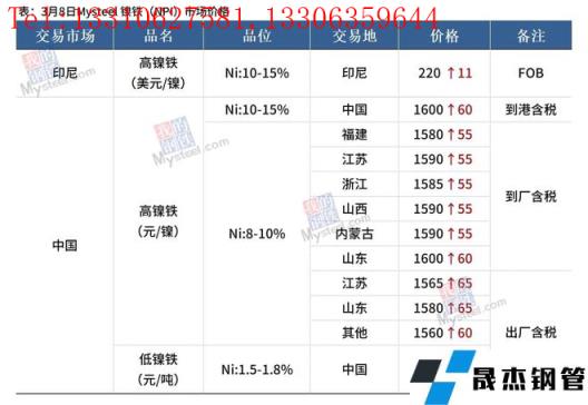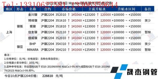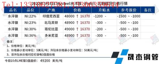 免責聲明:本網站(山東聊城晟杰無縫鋼管廠www.cuirutang.cn)刊載的“鎳產業鏈價格(2022.3.8)”等均源于網絡,版權歸原作者所有,且僅代表原作者觀點,本文所載信息僅供參考。轉載僅為學習與交流之目的,如無意中侵犯您的合法權益,請及時聯系刪除。本網站刊登此篇文章并不意味著本站贊同其觀點或證實其內容的真實性,我們不對其科學性、嚴肅性等作任何形式的保證。如果侵犯了您的版權,請盡快聯系我們予以撤銷,謝謝合作!