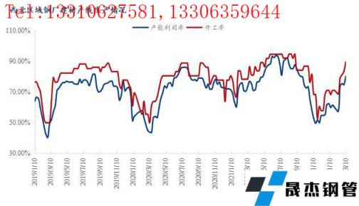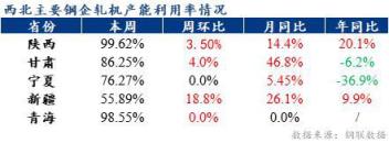 本周西北區(qū)域15家建筑厚壁無(wú)縫鋼管生產(chǎn)廠家48條產(chǎn)線實(shí)際開(kāi)工43條,軋線開(kāi)工率為89.58%,周環(huán)比上升6.25%;建材產(chǎn)線實(shí)際產(chǎn)量約67.06萬(wàn)噸,周環(huán)比增加6.35萬(wàn)噸,產(chǎn)能利用率為80.29%,周環(huán)比上升5.54%。