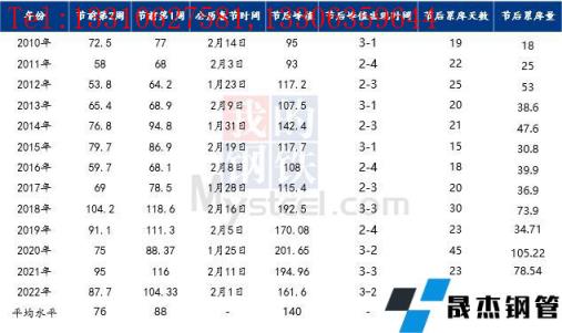 對比歷史數據來看,近10年來春節(jié)后廣州建筑厚壁無縫鋼管庫存峰值均出現第3-5周,累庫周期約24天左右;近5年來節(jié)后庫存累庫量明顯上升,節(jié)后峰值水平均超過150萬噸以上,而2017年之前節(jié)后庫存峰值均在140萬噸以內。近年來,隨著經濟發(fā)展以及供應擴張,春節(jié)前市場主動性冬儲積極性增加,整體的庫存量出現明顯上升; 雖然2022年節(jié)前價格偏高,但節(jié)前現貨價格上漲,帶動市場不少商家主動性囤貨、備貨,節(jié)前庫存總量并未出現明顯累庫現象。節(jié)后開市,在疫情等因素影響下,累庫速度遠低于去年,今年庫存呈現的特點是,累庫速度快,累庫量大,周期短等特點。同時再加上今年節(jié)后不少短流程企業(yè)并未完全恢復生產,自然資源供應量有所減量,節(jié)后累庫低于往年,且今年峰值出現在3月第1周,第二周迎來庫存拐點。