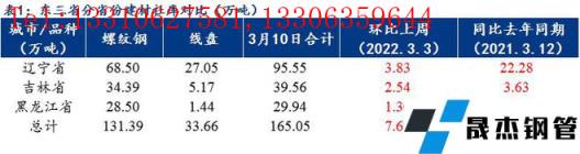 據悉近期區域內的主導無縫厚壁鋼管廠家生產節奏正常,產量無明顯增產或者減產的跡象,廠庫也處于常態水平,且遷移至市場上的現貨已接近飽和狀態。據我網調研來看,后續各大無縫厚壁鋼管廠家暫無對東三省各個城市大批量投放的計劃,他們仍以消耗市場上前移過去的現貨為主,主要原因是目前的螺紋鋼單噸利潤尚可,以沈陽市場為例,據推算某主導無縫厚壁鋼管廠家的單噸利潤可達約400元/噸,因此廠家以兌現利潤、變現為首要任務。其次隨著北方天氣的逐漸回溫,下游終端項目陸續開工,雖說是以在建的項目居多,新開工的項目較少,但是比起1-2月份,需求確實是在恢復,屆時現貨庫存也將流向下游,實現真正有效的消化。不過近期需要注意東北部分城市受疫情的影響,消費復蘇或將有所延遲,需求啟動不及預期,此形勢將對現貨庫存的消化產生影響,因此預估下周區域內建材社庫有望沖頂,當然也不排除有迎來降庫拐點的可能。