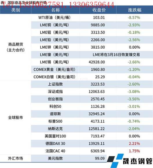◎ 倫敦金屬交易所(LME)稱鎳合約將在當(dāng)?shù)貢r(shí)間3月16日恢復(fù)交易,并對(duì)所有金屬的每日價(jià)格波動(dòng)施加15%幅度的限制。