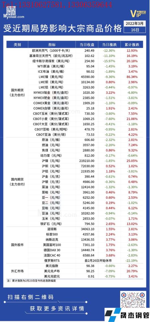 近期,受國際局勢影響,全球金融及大宗商品市場出現(xiàn)較大波動。據(jù)央視新聞報道,俄烏雙方準備好了一份在烏克蘭保持中立、裁軍的前提下實施的停火撤軍計劃,國際能源價格繼續(xù)大跌。倫敦金屬交易所則宣布,將不會發(fā)布周三收盤價,因為鎳價在收盤價確定期間處于跌停狀態(tài)。跌停價45590美元/噸將繼續(xù)用于LME清算所的保證金計算,以及周四漲跌停的基礎(chǔ)。另外,美聯(lián)儲加息如期而至,美國三大股指跌宕起伏走出V型反彈。匯總情況如下: