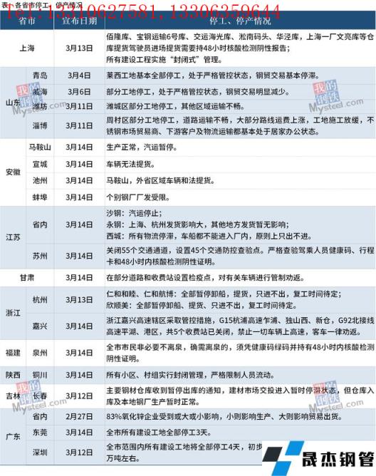 據(jù)統(tǒng)計,截至3月15日,全國多個省市發(fā)布停工停產(chǎn)情況。其中受疫情影響最大的吉林省于3月12日宣布,長春市主要厚壁無縫鋼管倉庫暫停出庫,當(dāng)?shù)亟ú氖袌鼋煌哆M入暫時停滯狀態(tài),倉庫入庫及本地?zé)o縫厚壁鋼管廠家生產(chǎn)暫時正常。深圳市于3月12日宣布,全市范圍內(nèi)所有建設(shè)工地暫定停工排查4天,南山及福田區(qū)域厚壁無縫鋼管市場預(yù)計共影響需求量約6640噸,深圳全市范圍初步預(yù)計共影響建筑厚壁無縫鋼管需求量約6萬噸。與此同時,全國其他地區(qū)鋼貿(mào)交易也受到影響,部分工地開始停工,物流運輸暫停服務(wù)。具體情況如下: