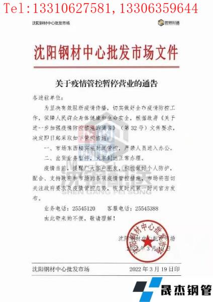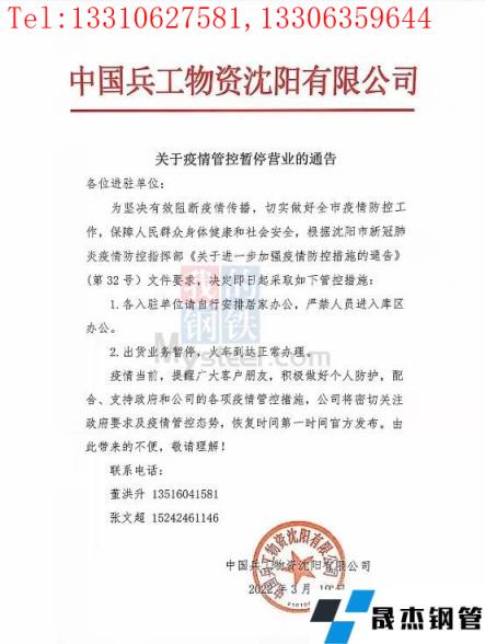 目前沈陽厚壁無縫鋼管中心批發(fā)市場已發(fā)布通告,19日起北一西路東西樓試試封閉管控、嚴禁人員進入辦公,出庫業(yè)務暫停、火車到達正常辦理;中國兵工物資125庫通告19日起嚴禁人員進入庫區(qū)辦公,出庫業(yè)務暫停、火車到達正常辦理;國家糧食和物資儲備局遼寧局二三九處通告19日起辦公樓嚴禁進出,庫內(nèi)所有出入庫業(yè)務暫停、火運到達正常辦理。市內(nèi)其他主要厚壁無縫鋼管市場反饋暫時正常辦公及出庫,但從防控指揮部通告內(nèi)容來看、也有暫停營業(yè)的傾向。(通告見文末圖片)