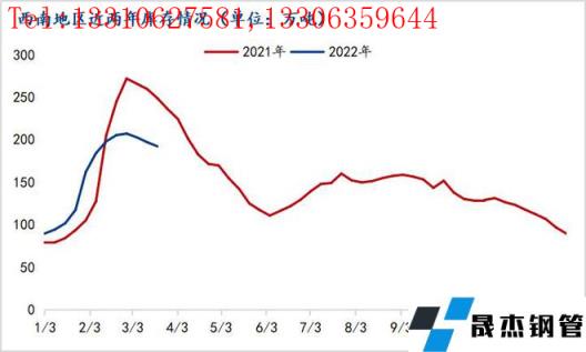 據(jù)西南地區(qū)近五年歷史庫存數(shù)據(jù)來看,庫存峰值基本在第三周或第四周出現(xiàn)(除去2020年疫情影響庫存峰值出現(xiàn)在第七周),節(jié)后累庫周期基本為2-3周,2022年西南地區(qū)建筑厚壁無縫鋼管峰值出現(xiàn)在第五周,累庫周期較往年長。峰值過后第一周去庫4.41萬噸,降幅2.13%,第二周去庫5.69萬噸,降幅2.8%,較往年去庫速度偏緩慢。主要原因是:1、今年春節(jié)時間較往年靠前,受極端天氣影響,春節(jié)后西南地區(qū)經(jīng)歷兩次降溫降雪天氣,影響出貨節(jié)奏;2、西南地區(qū)下游回款進(jìn)度僅60%左右,下游資金緊張,影響項目施工節(jié)奏,據(jù)了解,西南地區(qū)多數(shù)新開工項目要延期至4月中旬以后。3、全國疫情再次擴(kuò)散,下游施工受阻;4、其他因素,運費上漲、貴州開啟施工項目安全大檢查等。綜上原因,西南地區(qū)建筑厚壁無縫鋼管庫存累庫周期長,去庫速度緩慢。