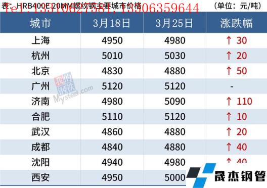截至3月25日,全國主要城市20mm三級抗震螺紋鋼均價4990元/噸,周環比上漲35元/噸;8.0mmHPB300高線均價5196元/噸,周環比上漲34元/噸。