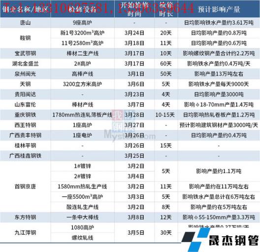 據不完全統計,截至3月28日超20家無縫厚壁鋼管廠家發布檢修計劃。其中,檢修時間最長的是湖北金盛蘭,計劃自3月17日對2#高爐進行檢修兩個月,預計影響鐵水產量約0.4萬噸/天,復產時間5月16日。