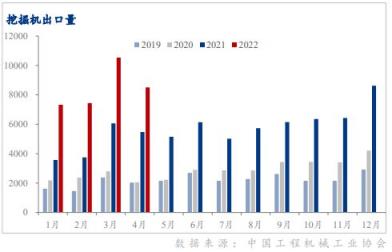 挖掘機(jī)出口一直保持著高速增長(zhǎng)的態(tài)勢(shì),4月出口量達(dá)到本月總銷量的34.65%,環(huán)比3月有所提高。主要是海外受到疫情影響,挖掘機(jī)供給不足,需求旺盛,促進(jìn)出口量持續(xù)增長(zhǎng)。出口占比總銷量份額提升,也反映出總銷量下滑的背景下,國(guó)內(nèi)需求難以釋放。