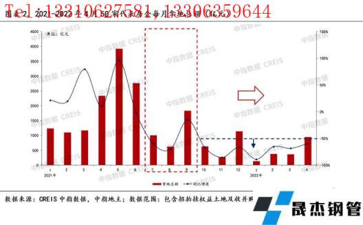 那么,預(yù)判今年用鋼情況的話,可以參考從2021年-2022年4月份以來的50家代表房企每月拿地總額數(shù)據(jù),假如往前倒推6個月,2022年1月起的房地產(chǎn)用鋼情況大致可以參照2021年7月起的拿地數(shù)據(jù),因為它并非一一對應(yīng)的關(guān)系。我們可以看到,從2021年10月以來的拿地數(shù)據(jù)不容樂觀,單月同比跌幅持續(xù)低于-50%水平線以下,預(yù)示接下來三季度的房地產(chǎn)新開工以及其用鋼情況理論上應(yīng)該是很差的。