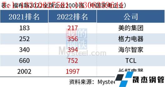 免責聲明:本網站(山東聊城晟杰無縫鋼管廠www.cuirutang.cn)刊載的“中國5家家電企業上榜福布斯2022全球企業2000強”等均源于網絡,版權歸原作者所有,且僅代表原作者觀點,本文所載信息僅供參考。轉載僅為學習與交流之目的,如無意中侵犯您的合法權益,請及時聯系刪除。本網站刊登此篇文章并不意味著本站贊同其觀點或證實其內容的真實性,我們不對其科學性、嚴肅性等作任何形式的保證。如果侵犯了您的版權,請盡快聯系我們予以撤銷,謝謝合作!