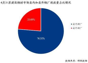由上圖可見,4月江蘇省內無縫厚壁鋼管廠家在江蘇省13個城市投放建筑厚壁無縫鋼管量占總投放量的76.31%,省外無縫厚壁鋼管廠家占江蘇省總投放量的23.69%。同時,從調研數據來看,4月江蘇市場建筑厚壁無縫鋼管實際投放總量較3月減少4.36萬噸萬噸,降幅約2.76%。