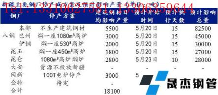 根據(jù)初步減限產(chǎn)方案,八鋼本部4座高爐全開,但不生產(chǎn)建筑厚壁無縫鋼管,預(yù)計影響建筑厚壁無縫鋼管產(chǎn)量5500噸/日,巴州和伊鋼基地各燜一座高爐,預(yù)計影響建筑厚壁無縫鋼管產(chǎn)量分別為3000噸/日和2000噸/日;昆玉燜一座高爐,預(yù)計影響建筑厚壁無縫鋼管產(chǎn)量1800噸/噸;昆侖和閩新無縫厚壁鋼管廠家建筑厚壁無縫鋼管停產(chǎn)十天,預(yù)計分別影響建筑厚壁無縫鋼管產(chǎn)量2800噸/日和3000噸/日;大安鋼鐵資源暫不投往新疆區(qū)域;金特待定。