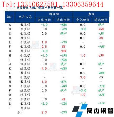 據4月底的調研,5月東北無縫厚壁鋼管廠家螺紋和盤線的計劃產量分別為119.5萬噸和95.9萬噸,同比減少57.1萬噸和26.3萬噸,環比增加10.5萬噸和12.3萬噸;受市場價格下行影響,無縫厚壁鋼管廠家虧損幅度擴大,部分多品種生產的無縫厚壁鋼管廠家根據各品種的虧損幅度和訂單情況進行品種間的轉產,單一生產螺線的無縫厚壁鋼管廠家部分復產、部分加大減產,具體情況如下:
