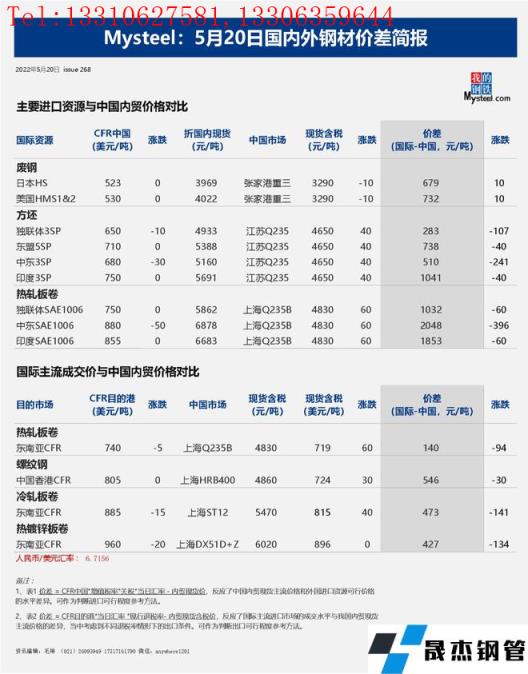 免責聲明:本網站(山東聊城晟杰無縫鋼管廠www.cuirutang.cn)刊載的“2022年05月20日日報:國內外鋼材_無縫鋼管價差匯總(2022.5.20)”等均源于網絡,版權歸原作者所有,且僅代表原作者觀點,本文所載信息僅供參考。轉載僅為學習與交流之目的,如無意中侵犯您的合法權益,請及時聯系刪除。本網站刊登此篇文章并不意味著本站贊同其觀點或證實其內容的真實性,我們不對其科學性、嚴肅性等作任何形式的保證。如果侵犯了您的版權,請盡快聯系我們予以撤銷,謝謝合作!