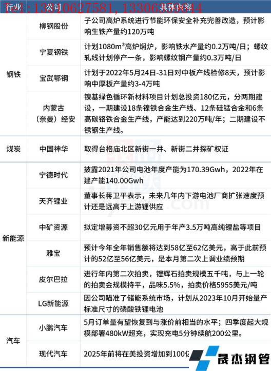 5月24日,匯總部分大宗商品相關(guān)企業(yè)動(dòng)態(tài)。寧夏鋼鐵、寶武鄂鋼宣布檢修計(jì)劃,柳鋼股份計(jì)劃進(jìn)行高爐改造;天齊鋰業(yè)董事長(zhǎng)蔣衛(wèi)平表示,鋰電行業(yè)景氣度高,未來幾年內(nèi)下游電池廠商擴(kuò)張速度預(yù)計(jì)還是遠(yuǎn)高于上游鋰供應(yīng)。具體情況如下: