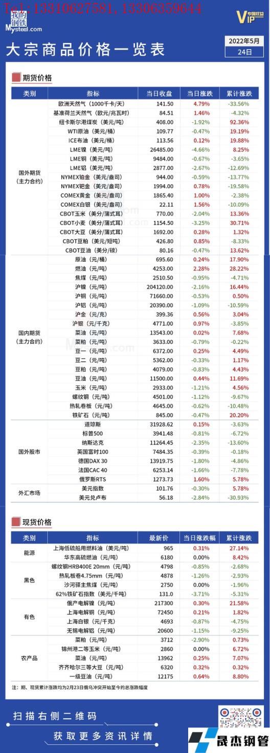 免責聲明:本網站(山東聊城晟杰無縫鋼管廠www.cuirutang.cn)刊載的“俄烏局勢丨大宗商品價格一覽表(5月24日)”等均源于網絡,版權歸原作者所有,且僅代表原作者觀點,本文所載信息僅供參考。轉載僅為學習與交流之目的,如無意中侵犯您的合法權益,請及時聯系刪除。本網站刊登此篇文章并不意味著本站贊同其觀點或證實其內容的真實性,我們不對其科學性、嚴肅性等作任何形式的保證。如果侵犯了您的版權,請盡快聯系我們予以撤銷,謝謝合作!