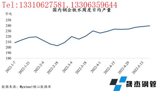 截止到5月20日, 247家鋼鐵企業(yè)樣本日均鐵水產(chǎn)量由4月初的226.1萬(wàn)噸上漲13萬(wàn)噸,漲幅約為5.7%。