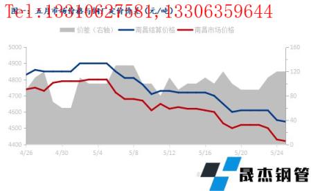 5月份南昌建筑厚壁無縫鋼管市場價格一路下行,具體來看,4月26日至5月25日期間南昌建筑厚壁無縫鋼管現貨市場最高價格為4800元/噸,最低價格為4420元/噸,較上月最高價與最低價分別下降70元/噸和300元/噸,期間市場價格單邊下行振幅為380元/噸。