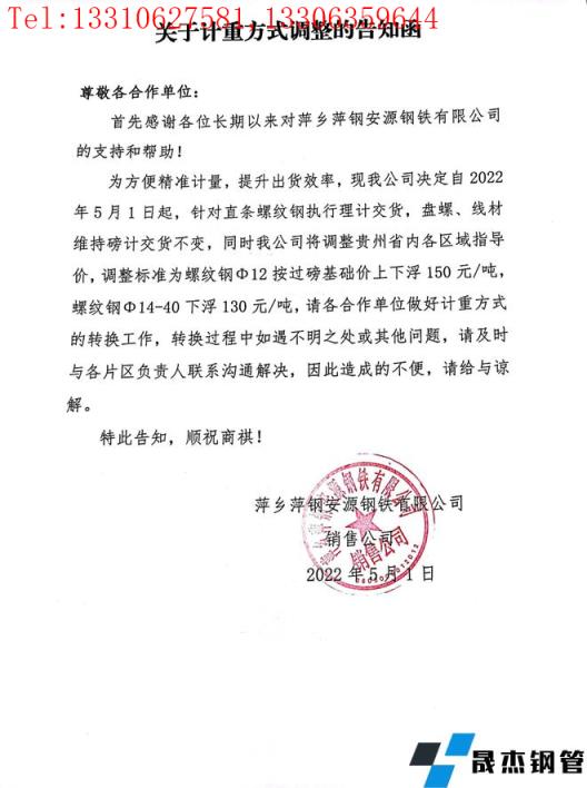 免責聲明:本網站(山東聊城晟杰無縫鋼管廠www.cuirutang.cn)刊載的“萍鄉萍鋼安源鋼鐵有限公司關于對貴州區域計重方式調整的告知函”等均源于網絡,版權歸原作者所有,且僅代表原作者觀點,本文所載信息僅供參考。轉載僅為學習與交流之目的,如無意中侵犯您的合法權益,請及時聯系刪除。本網站刊登此篇文章并不意味著本站贊同其觀點或證實其內容的真實性,我們不對其科學性、嚴肅性等作任何形式的保證。如果侵犯了您的版權,請盡快聯系我們予以撤銷,謝謝合作!