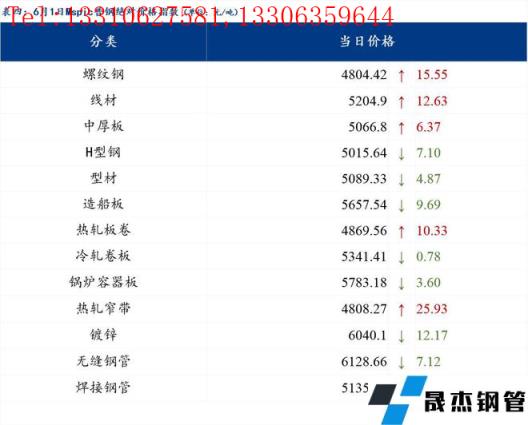 6月1日普鋼絕對價格指數(shù)變化:綜合指數(shù)5051.85,上漲9.41;螺紋鋼指數(shù)4804.42,上漲15.55;線材指數(shù)5204.9,上漲12.63;熱軋板卷指數(shù)4869.56,上漲10.33;冷軋板卷指數(shù)5341.41,下跌0.78;中厚板指數(shù)5066.8,上漲6.37。