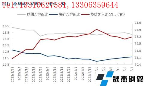自今年春節開始,無縫厚壁鋼管廠家高爐中粉礦、塊礦、球團入爐配比變化趨勢明顯。截至5月27日, 64 家無縫厚壁鋼管廠家燒結礦配比73.2%,環比1月29日增加2.2個百分點,同比去年同期增加1.8個百分點;塊礦入爐比例11.7%,環比春節期間下降1.1個百分點,同比降0.3個百分點;球團入爐配比15.2%,環比亦下降1.1個百分點,同比降1.4個百分點。