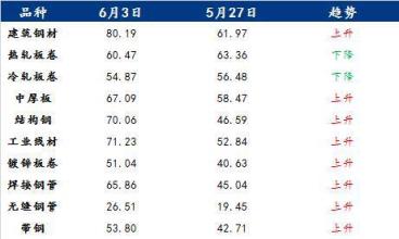 具體各品種指數來看,6月3日建筑厚壁無縫鋼管情緒指數為80.19,較5月27日回升18.22;熱軋板卷情緒指數為60.47,較5月27日回落2.89;冷軋板卷情緒指數為54.87,較5月27日回落1.61;中厚板情緒指數為67.09,較5月27日回升8.62;結構鋼情緒指數為70.06,較5月27日回升23.47;工業線材情緒指數為71.23,較5月27日回升18.39;鍍鋅板卷情緒指數為51.04,較5月27日回升10.41;焊接厚壁鋼管情緒指數為65.86,較5月27日回升20.82;無縫厚壁鋼管情緒指數為26.51,較5月27日回升7.06;帶鋼情緒指數為53.8,較5月27日回升11.09。