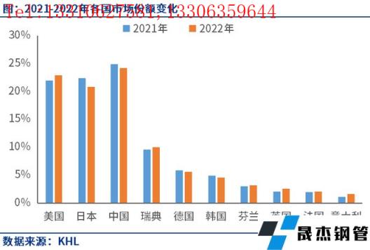 分國別來看,2022年全球各國市場份額排名前三的國家分別是中國、美國、日本,2022年這三個國家市場份額分別為24.2%、22.9%、20.8%,三個國家在全球市場份額已經達到了67.9%。其中,中國和日本2022年市場份額分別下降0.7個百分點、1.6個百分點,美國2022年市場份額提高1個百分點。
